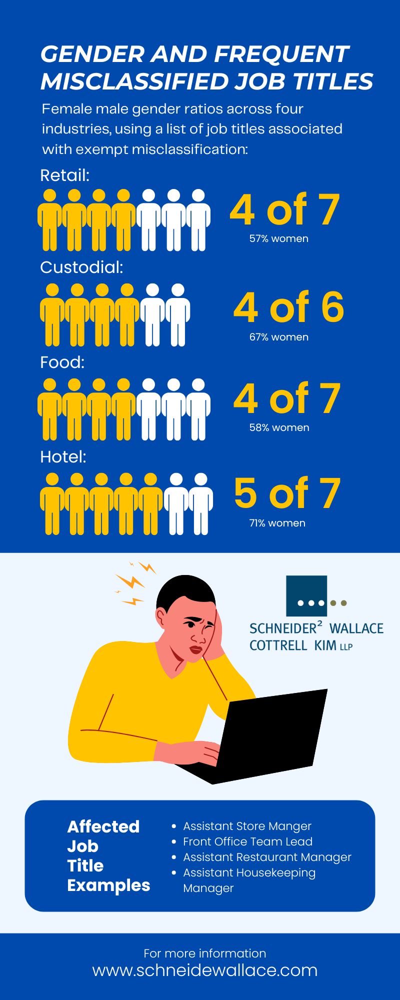 Misclassification is a widespread form of wage theft. It allows employers to avoid paying legally required overtime by assigning inflated job titles that don’t reflect the actual work performed. This tactic is especially common in frontline industries like retail, food service, hospitality, and janitorial work—and our data shows it may disproportionately affect women in some job titles, but is not legal regardless.
